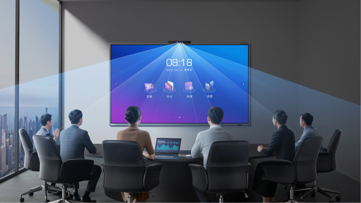 视觉层面,皓丽会议平板创新推出了超级AI四摄系统,通过索尼大底传感器与自研VCS人眼仿生技术,实现115°超广角全覆盖与超精度人脸追踪,参会者无论身处角落还是移动发言,都能被清晰捕捉,让远程沟通如同面对面交流。音频方面,8阵列12米拾音麦克风搭配腾讯天籁inside解决方案,可过滤300多种环境噪声,确保不同位置发言者的声音清晰均匀,彻底告别会议中的“听觉混乱”。